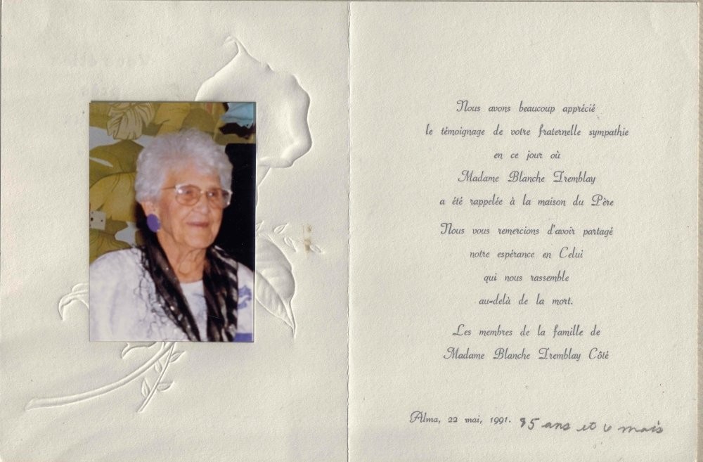 DÉCÈS : 22 mai 1991 Alma, Lac-Saint-Jean-Est, QC, Canada