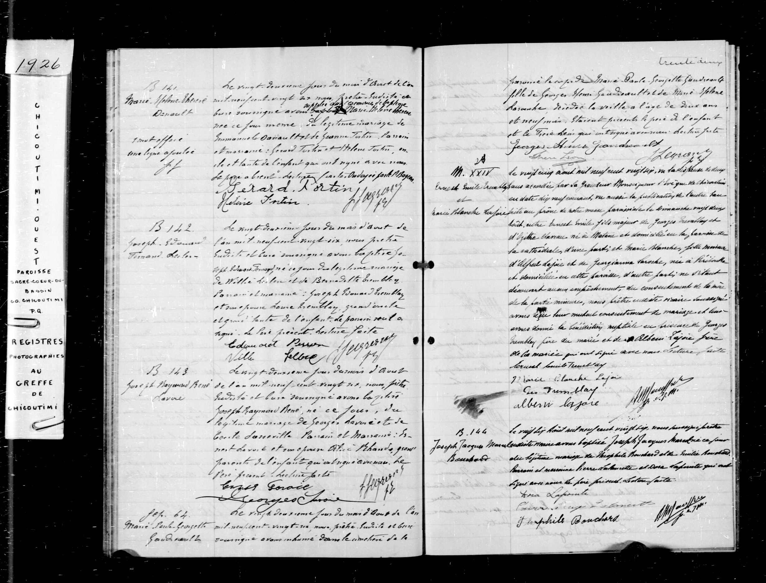 Mariage ou Union de fait : 25 août 1926 Sacré-Coeur-du-Bassin/Chicoutimi, Le Fjord-du-Saguenay, QC, Canada PG2