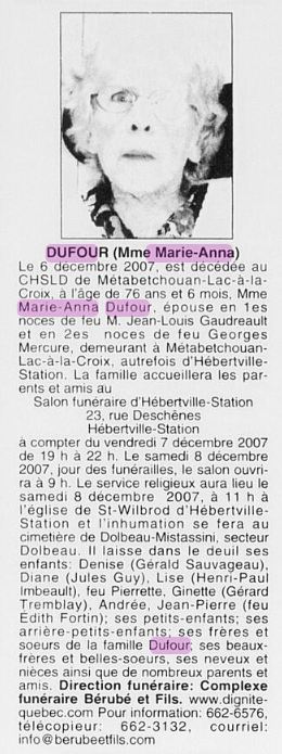 | 01 | Marie-Anna DUFOUR | La défunte Conjointe de 02 | F |